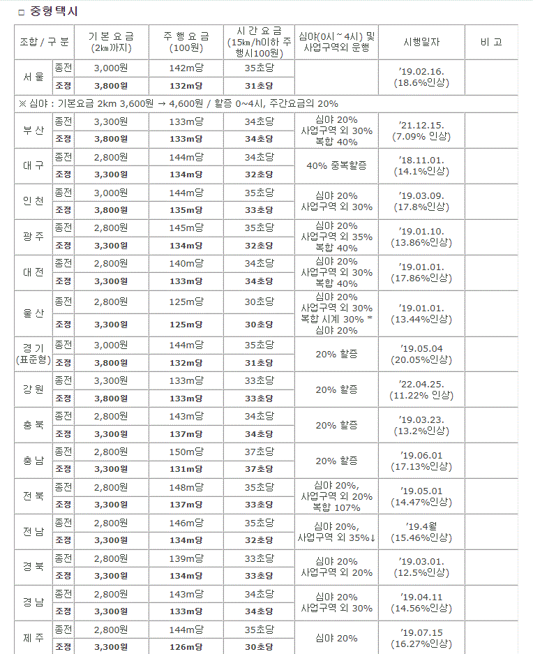 - 모범,대형택시 : 기본요금 6,500원 → 7,000원