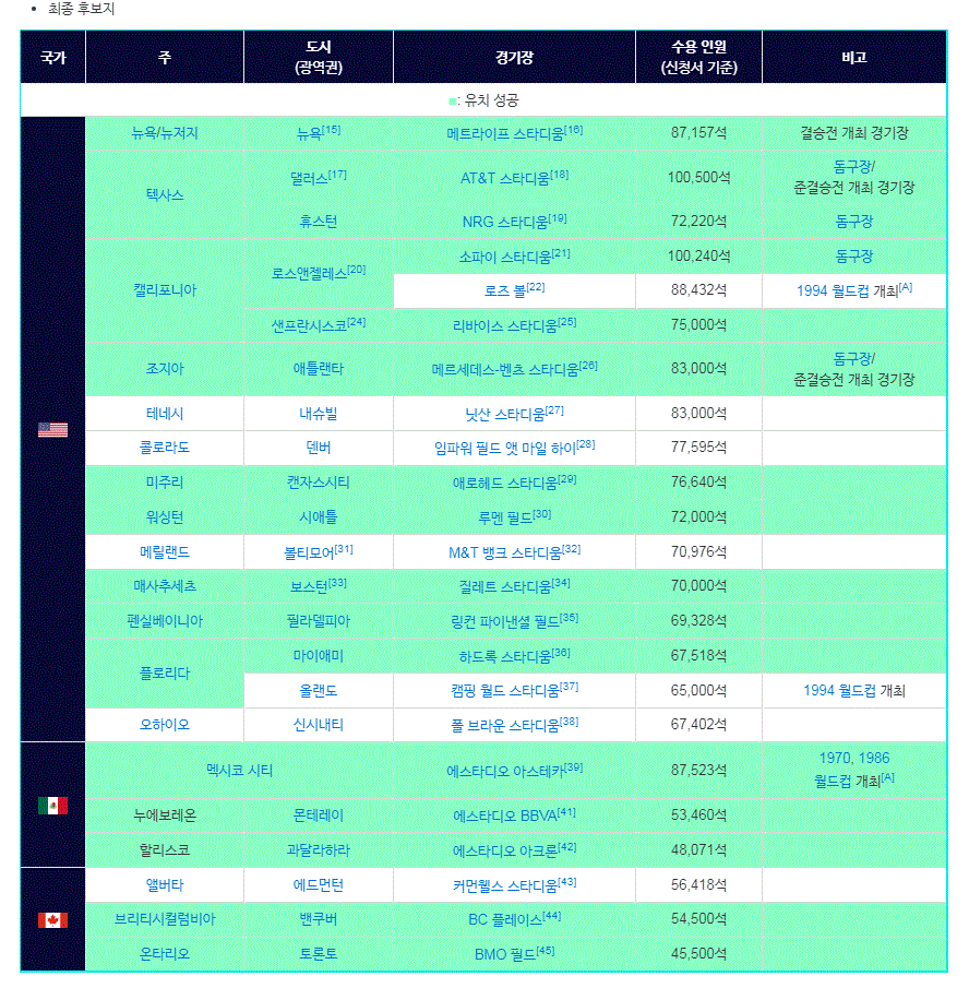 2026 FIFA 월드컵 캐나다/멕시코/미국 경기를 유치할 최종 후보지는 23개로 결정되었으며, 2020년에 FIFA에 의해 경기가 펼쳐질 16개(미국 10개, 캐나다와 멕시코 각각 3개)의 경기장이 확정됩니다. 이 중 캐나다와 멕시코는 모두 기확정되었습니다. 캐나다는 후보지가 4개로 선정되었으나, 전술한 대로 밴쿠버가 유치를 철회하면서 기확정되었습니다.