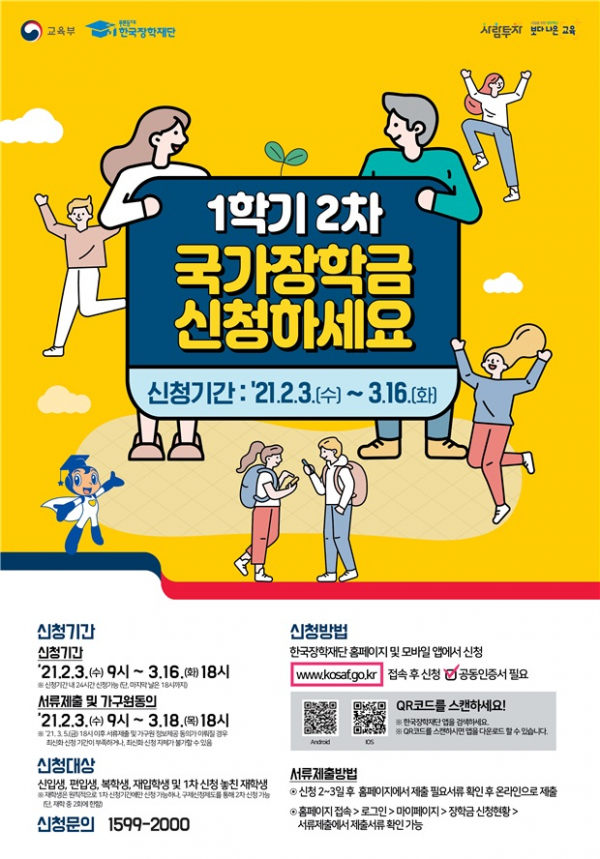 2021년 맞춤형 국가장학금 기본계획을 21년 2월 2일(화)에 발표를 하였습니다. 국가장학금 기본계획은 그간 별도 사업으로 발표 및 추진되었던 "국가장학금", "대학생 근로장학사업", "우수학생 국가장학사업"의 지원계획을 포괄한 종합 방안입니다.기초,차상위 계층 학생에 대한 지원금 대폭 인상 및 저소득층 고고생 4만 4000여 명이 국비로 해외 유학 기회를 얻게 됩니다. 코로나(COVID-19)로 인하여 실직 혹은 폐업을 겪은 가정에도 "추가 장학금"이 지원됩니다.