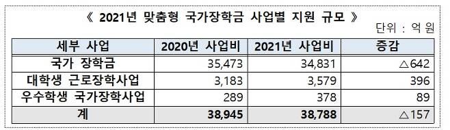 2021년에는 코로나-19 여파로 인하여 가계 실직, 폐업 등 경제상황이 곤란해진 학생에게 등록금의 10% 만큼 추가 지원을 진행합니다. 올해 맞춤형 국가장학금 총규모는 3조 8788억 원이며, 총 학생 115만 명을 지원합니다. 맞춤형 국가장학금 사업은 코로나-19 상황을 고려해 제도를 개선하는데 중점을 두었습니다.