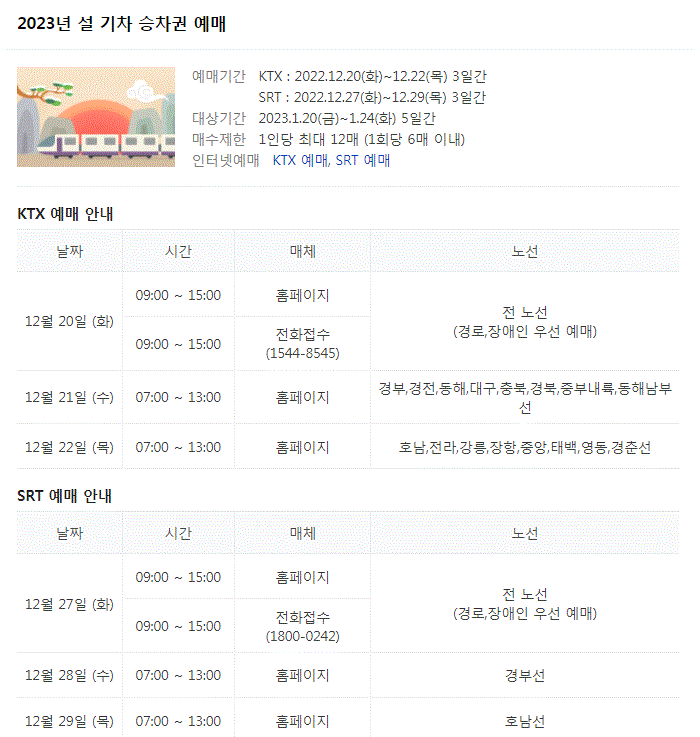설 승차권 예매 안내 - 12월 20일(화) 9:00~15:00 : 장애인, 경로 - 12월 21일(수) 7:00~13:00 : 경부선, 경전선, 동해선(포항) 등 - 12월 22일(목) 7:00~13:00 : 호남선, 전라선, 강릉선, 중앙선 등