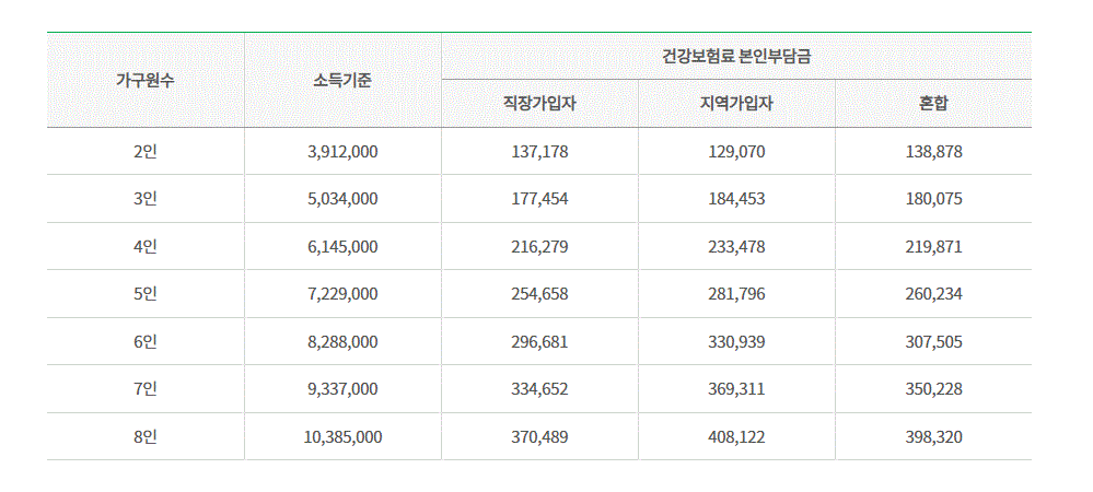 가구원 수에 따라 건강보험료 본인부담금 금액을 확인해보시면 됩니다. 2022년 가족수·가입유형별 기준중위소득 120% 이하 판정 기준표이며, 지역마다 대상자 기준중위소득은 다를 수 있습니다.