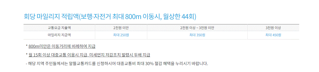대중교통 요금 및 이동거리에 비례하여 기본 마일리지를 적립해주고 미세먼지 발령일에는 추가 마일리지가 일괄 적립 및 지급됩니다.