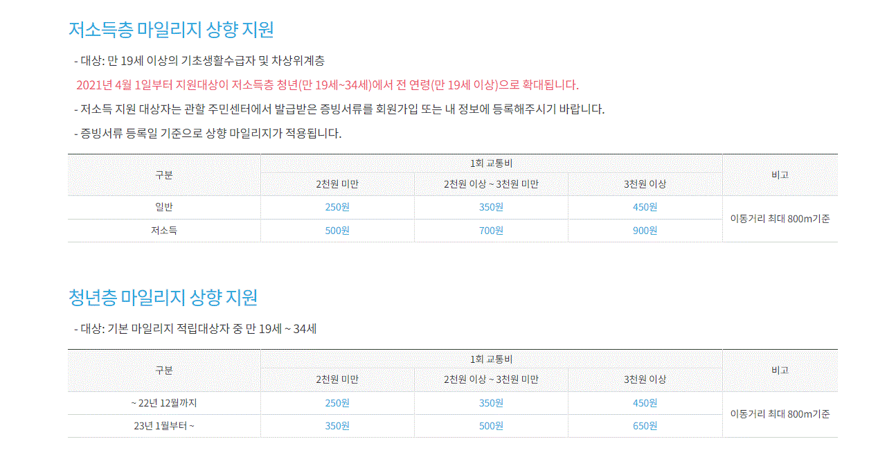 1회 교통요금 지출액이 2천 원 미만이면 250원, 2천 원~3천 원 미만이면 350원, 3천 원 이상은 450원의 마일리지가 적립되는 것이 일반 혜택입니다. 여기에 만 19세~34세인 청년층을 신설하여 최대 38%까지 혜택을 더 받고, 기존 저소득층은 최대 50%까지 상향되어 혜택 받을 수 있습니다.