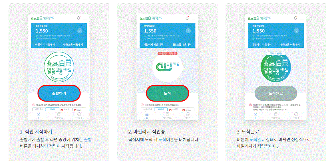 대중교통 승차를 위해 자택 등에서 출발시에는 알뜰교통카드 앱을 실행하여 '출발' 버튼을 클릭하시고 대중교통 하차 후 도착지에서 알뜰교통카드 앱을 실행하여 '도착' 버튼을 클릭하시면 됩니다.