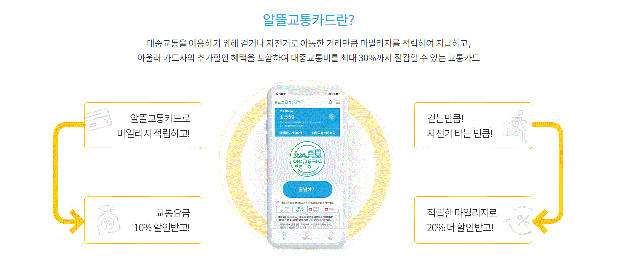 대중교통을 통해 건강은 물론 환경에도 좋고 교통비 부담을 덜어 경제적인 이점을 얻을 수 있으니 알뜰교통카드 사용은 좋은 이점이 다양하게 있는 것 같습니다.
