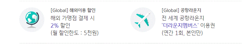 글로벌형은 pay형과 다르게 추가할인 혜택은 없으며 해외가맹점 결제 시 2% 할인과 언간 1회 라운지 이용권 혜택이 있습니다.