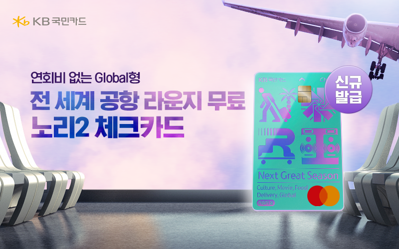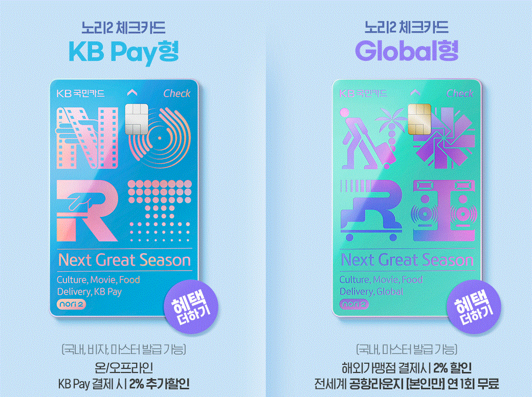 노리2체크카드는 KB pay형과 global형 둘 중 한가지 형으로 발급이 가능합니다. 공동혜택은 동일하나 글로벌형은 해외결제/전세계 라운지 연1회 무료제공 추가혜택이 있고, KB pay형은 2% 추가할인 혜택이 있습니다.