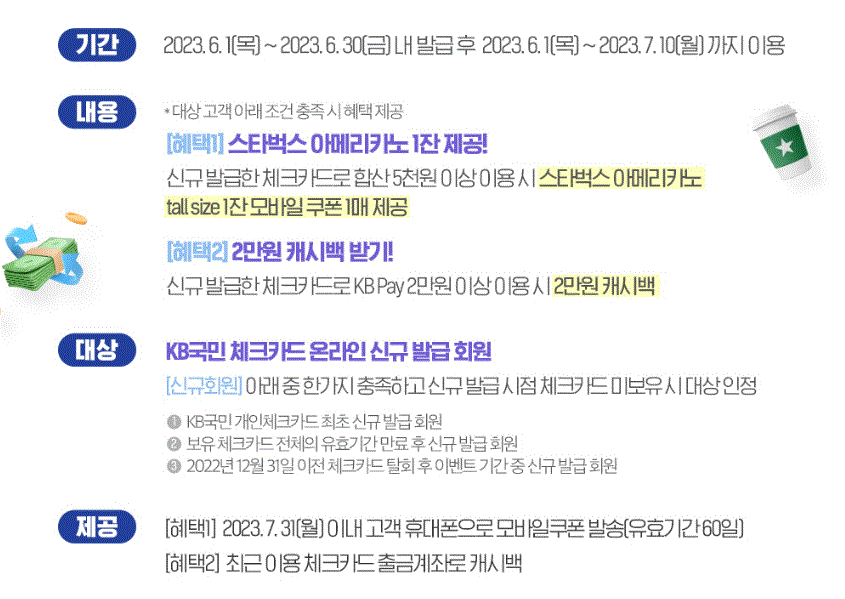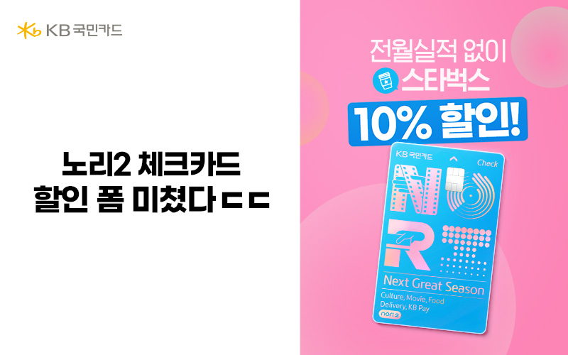 현재 노리2체크카드 온라인 신규회원 가입 시 스타벅스 쿠폰과 2만원 캐시백 혜택이 있습니다. 23. 6. 1일 부터 23.6.30일 내 발급 후 23.6.1일 부터 23.7.10일까지 5천원 이상이용하시면 스타벅스 아메리카노 모바일 쿠폰 1매 제공되며, KB pay 2만원 이상 이용 시 2만원 캐시백 혜택이 주어집니다. 온라인 신규 발급 회원 대상시 진행되는 이벤트로 조건이 있으니 해당되신다면 신청해서 다양한 혜택도 받아 보시길 바랍니다