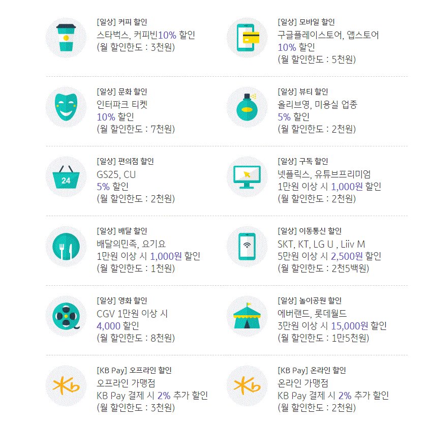 두가지 형의 노리2체크카드의 주요혜택은 스타벅스, 커피빈 이용시 할인, 미용실과 화창품매장 뷰티 할인, 티켓할인, 편의점 할인, OTT 할인, 배민, 요기요 배달할인, 통신요금 할인, 영화관 할인, 놀이공원할인 등 풍성한 혜택을 주요 혜택으로 드리고 있습니다.