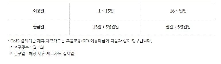 단, 정상출금 되지않은 경우 연체로 인하여 교통카드기능을 사용할 수 없으며 미납금액에 대해서는 연체료가 부과됩니다.