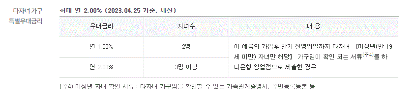 다자녀 가구 특별우대금리도 있는데 자녀수가 2명일 시 연 1.0% 3명 이상 시 연 2.0%의 금리를 제공합니다.