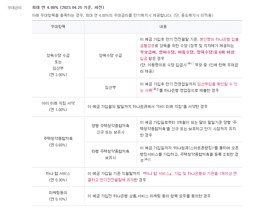 우대금리의 조건은 본인명의 하나은행 입출금 통장으로 양육을 위한 수당을 6회 이상 입금받은 경우 또는 임산부 확인시 연 2.0%, 아이 미래 지킴 서약시 연 1.0%, 하나은행 당행 주택청약종합저축 가입 또는 보유시 연 0.6%, 하나 합 서비스 가입시 연 0.3%, 마케팅 동의 시 연 0.1%의 우대금리를 지급합니다.