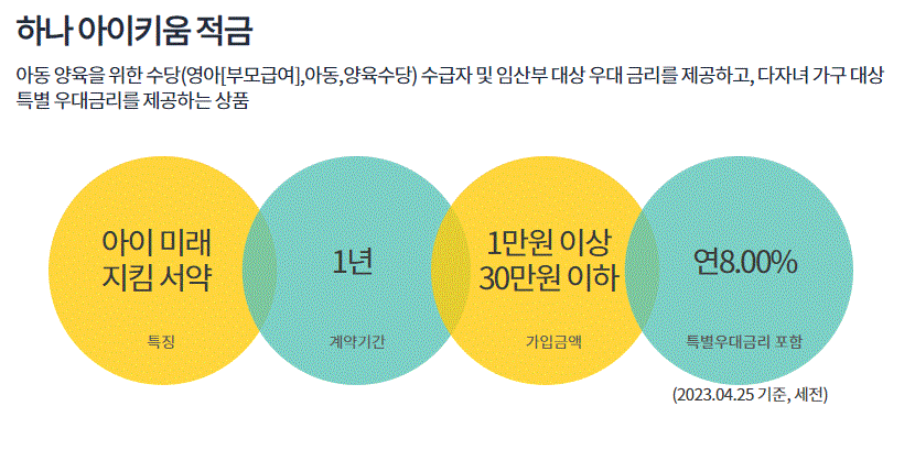 하나 아이키움 적금은 아동양육을 하는 수당(영아[부모급여], 아동, 양육수당) 수급자 또는 임산부 대상으로 우대 금리를 제공합니다. 또한, 다자녀 가구 대상으로 특별우대금리를 제곰하는 상품입니다. 특판으로 나왔으며, 5만계좌 한정으로 한도 소진 시 판매는 중지됩니다.