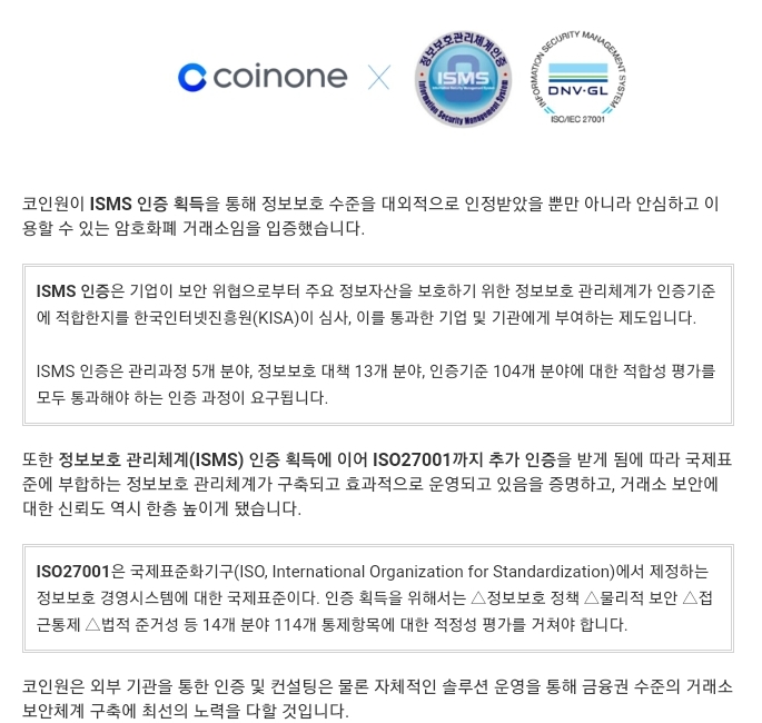 코인원(Coinone) 거래소는 2014년 2월 설립되었으며, 2015년 데일리 금융그룹(옛 옐로 금융그룹)이 인수한 데일리 금융그룹 자회사인 가상화폐 거래소입니다. 코인원 보안정책은 정보보호관리체계 ISMS 인증 X 국제표준 정보보호 인증 ISO27011 획득한 코인원(Coinone) 거래소입니다.