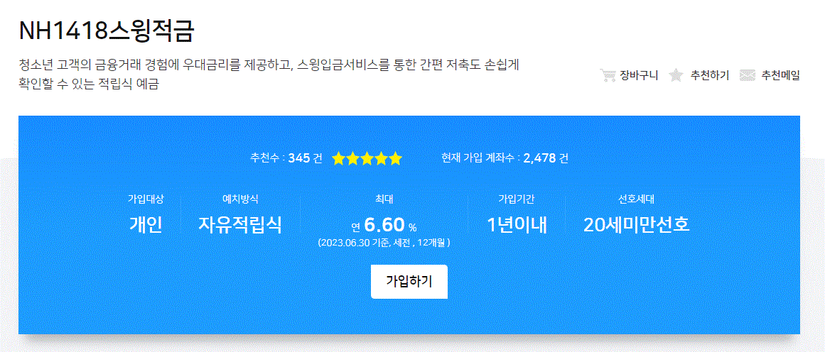 - 가입 시 NH1418우대통장과 스윙입금서비스를 연결하고 만지해지시까지 유지할 경우 0.5%