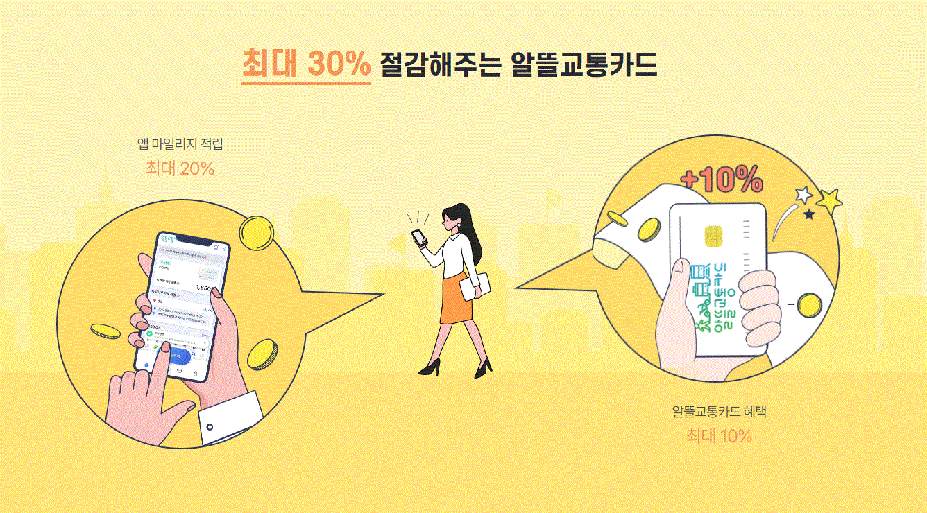 지하철이나 버스 등 대중교통 이용할때 한 달 5만 원의 비용으로 알뜰교통플러스 카드 사용 시 대중교통 할인 10% 혜택 2000원 알뜰교통 마일리지 1만 원 총 1만 2000원을 절감할 수 있습니다.