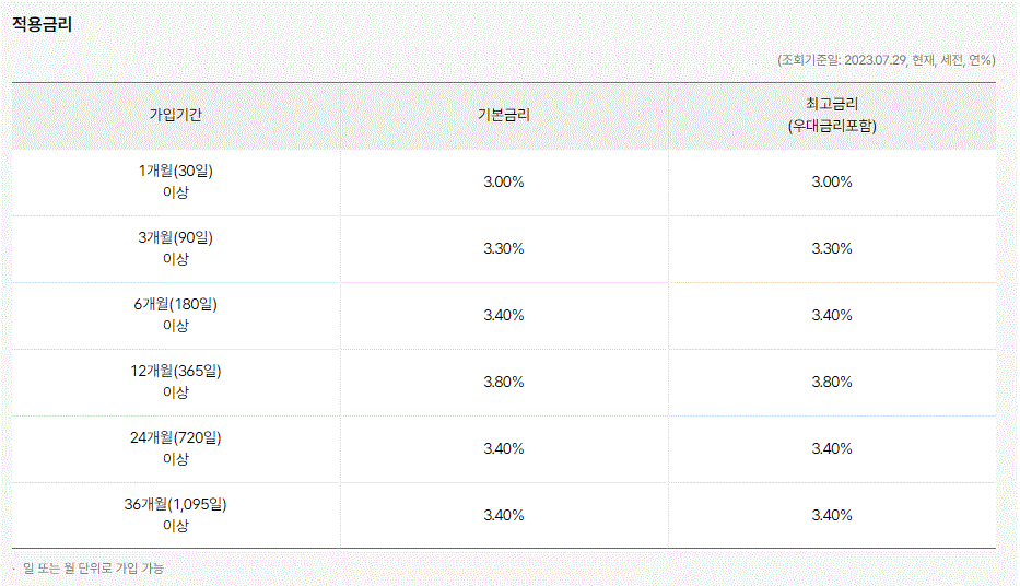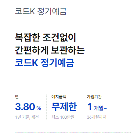 코드K 정기예금은 만기일시지급식으로 만 17세 이상이면 가입할 수 있습니다. 가긴은 1~36개월로 가입할 수 있으며 금액은 100만 원 이상부터입니다. 비과세종합저축 가능하며 2회 부분인출 할 수 있다는 장점이 있습니다. 금리는 1개월 3.00%, 3개월 3.30%, 6개월 3.40%, 12개월 3.80%입니다.
