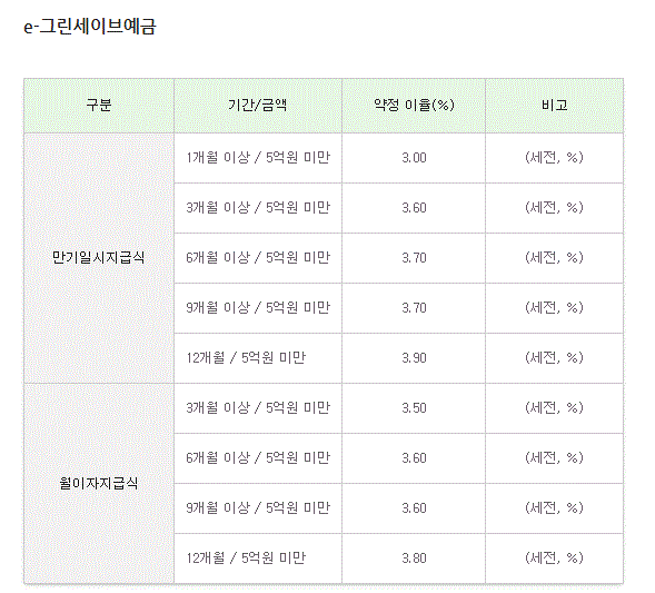 SC제일은행 e-그린세이브 예금은 1개월 이상 12개월까지 가입할 수 있으며 금액은 최소 100만 원부터 5억 원 미만까지 가능합니다. 분할인출 안되며 온라인 정기예금으로 앱이나 인터넷을 통해 가입할 수 있습니다. 이자는 1개월 3.00%, 3개월 3.60%, 12개월 3.90%이며 신규가입 시 최대 0.3% 금리 지급되어 금리는 더 높아질 수 있습니다.