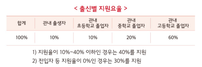 대학 등록금 중 국가·학교·기관 및 단체·보호자의 직장 등에서 받는 등록금(장학금)을 제외한 실제 본인부담금(입학금, 수업료 등)의 필수경비에 대해 전액 지원합니다. 다만, 지역 내 출생 및 지역 초·중·고 졸업 유무에 따라 차등지원되며 최소 30% ~ 최대 100%로 적용됩니다.