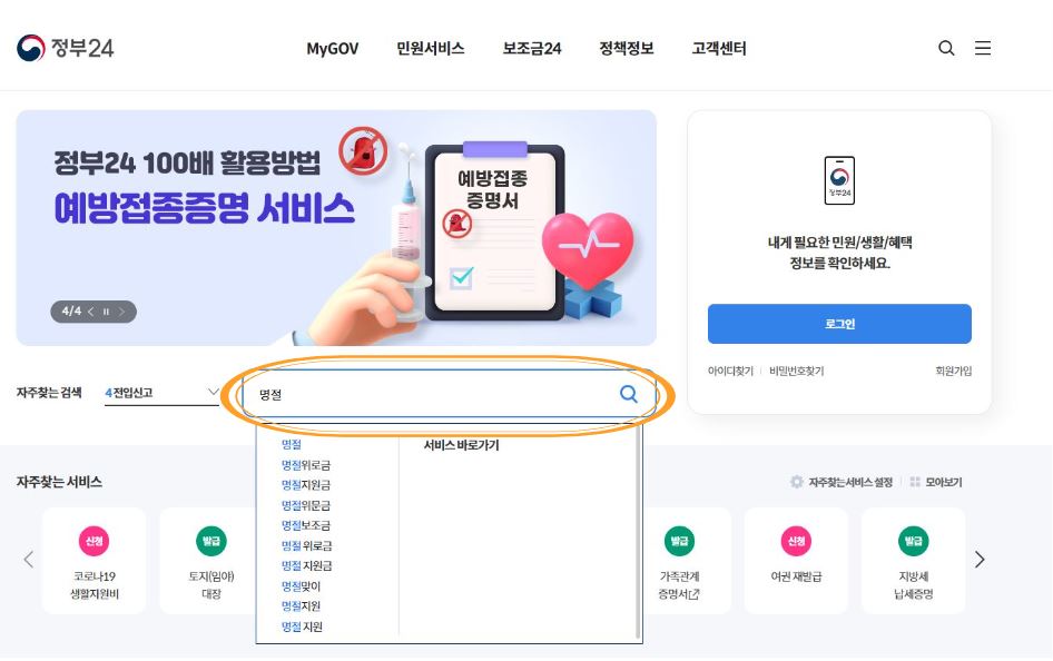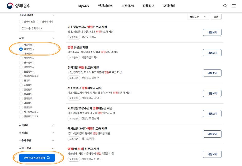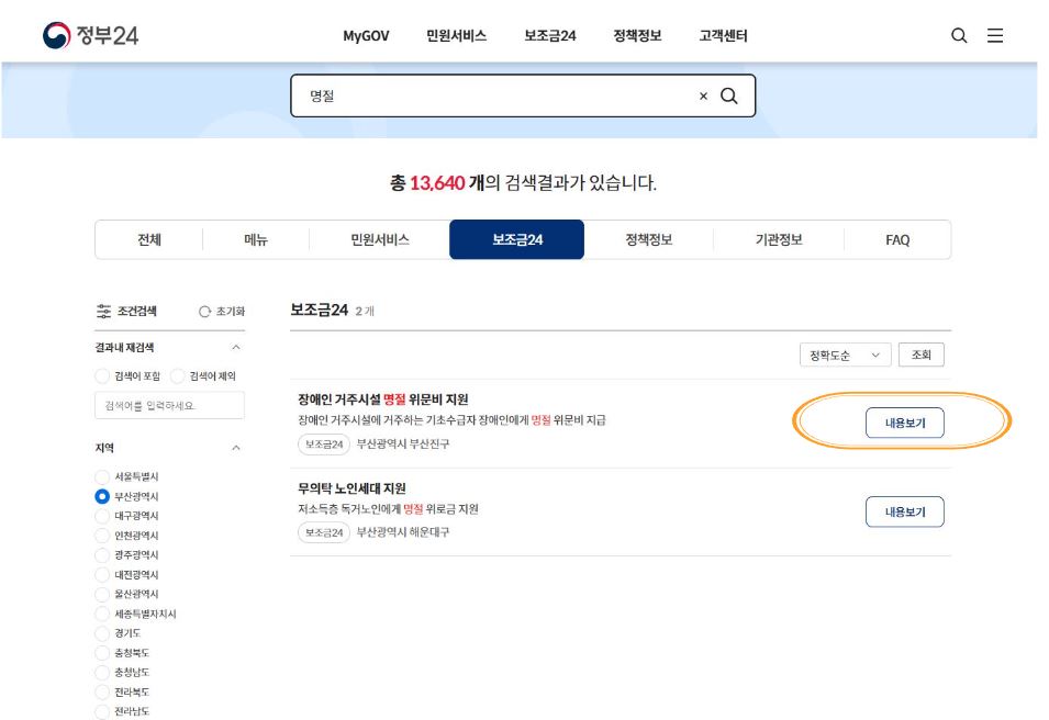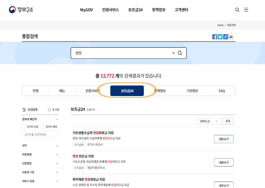 명절지원금은 정부 24 홈페이지를 통해 신청가능한지 확인할 수 있습니다. 대부분의 경우 별도신청 없이 지자체에서 대상자를 선정하여 수급자의 계좌로 지급됩니다. 지자체에 따라 상이하니 별도 확인 후 주민센터 방문 신청하는 지역은 직접 방문하여 신청하시면 됩니다.