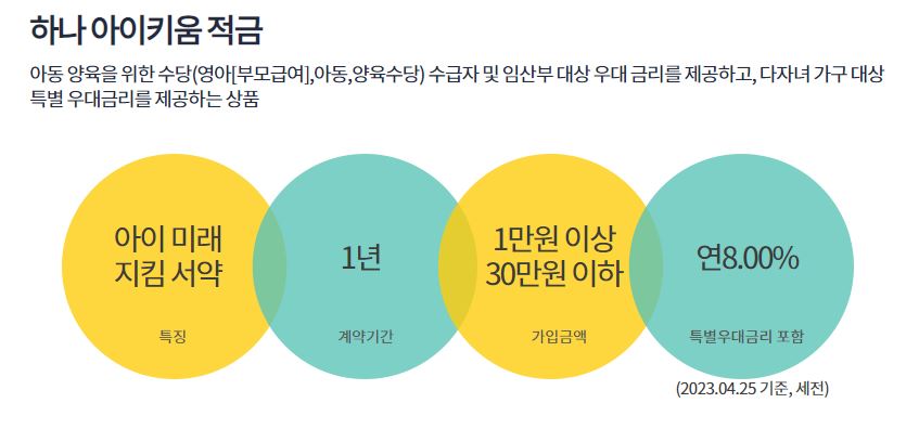 하나 아이키움 적금은 부모급여, 아동양육수당을 받는 부모, 임산부를 대상으로 우대금리를 제공하고 다자녀가구 대상으로 특별금리까지 제공해 주는 적금입니다.