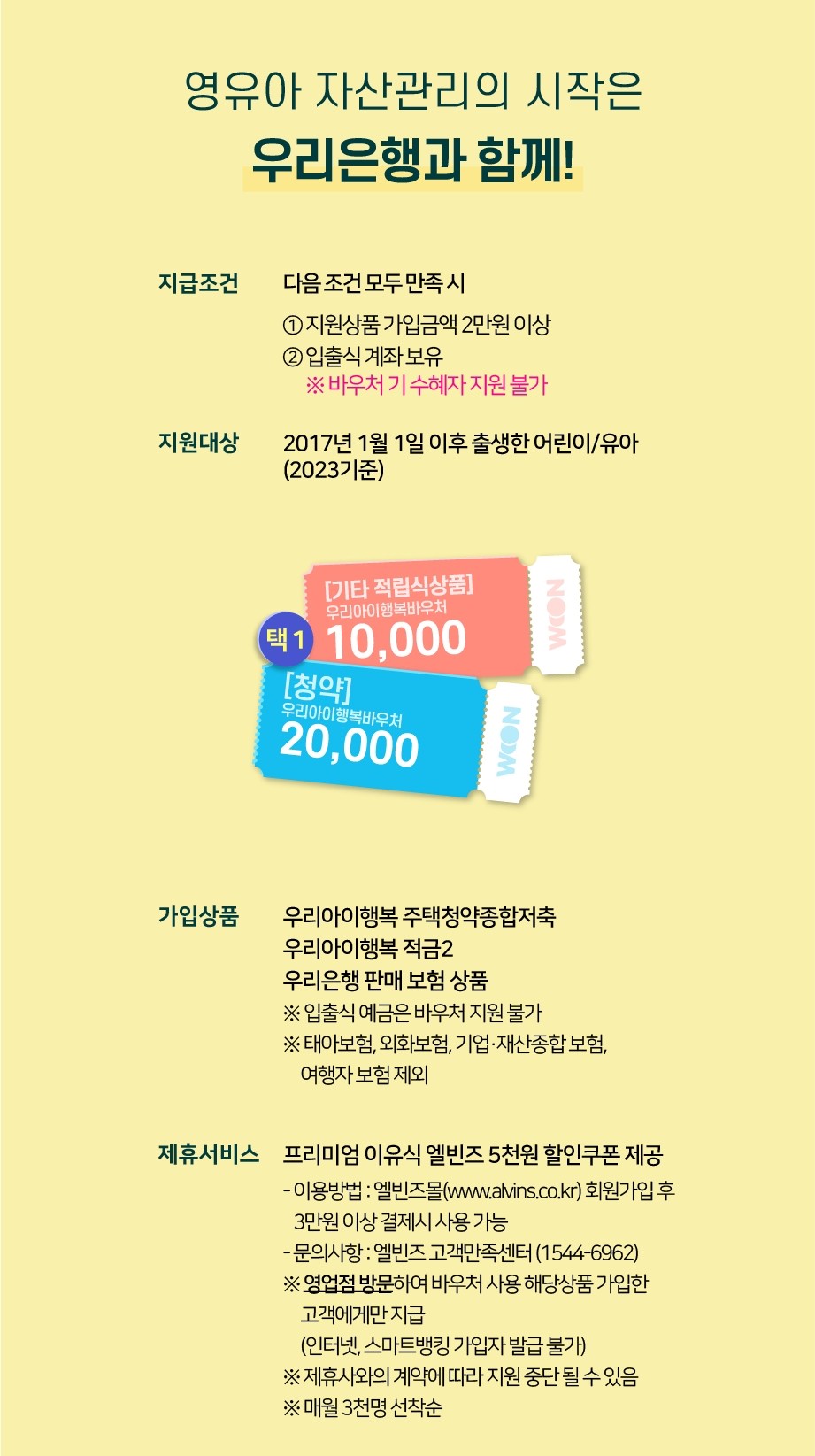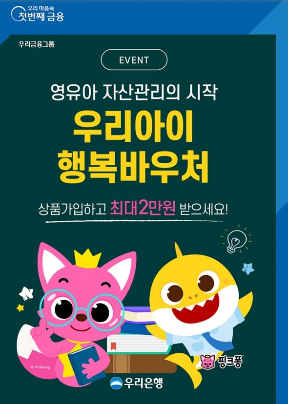 우리은행도 2017년 1월 1일 이후 출생한 어린이 또는 유아에게 금융바우처를 지원합니다. 우리은행에서 판매하는 우리 아이행복 주택청약종합저축 또는 우리아이행복적금2, 우리은행에 판매중인 보험 상품 가입에 한해 지원하며, 우리아이행복 종합청약종합저축 가입 시 2만 원, 우리아이 행복적금2, 우리은행 판매 보험상품 가입시 1만원이 지원됩니다.