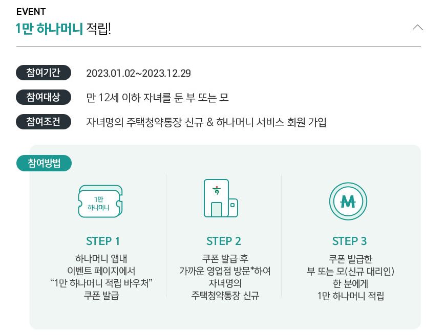 하나은행은 23년 기준 만 12세 이하 어린이가 청약통장 가입 시 1만 하나머니를 제공합니다. 하나머니 앱 내 이벤트페이지에서 '1만 하나머니 적립 바우처' 쿠폰 발급 후 영업점 방문하셔야 바우처가 제공되니, 은행 영업점 방문 전에 꼭 미리 발급받아서 아이 주택청약통장 개설하시면 됩니다.