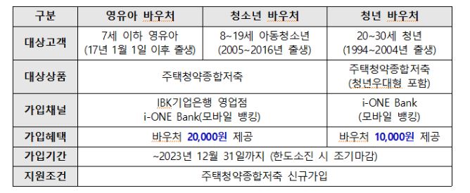 IBK기업은행에서는 2017년 1월 1일 이후 출생 영유아(7세 이하) 대상으로 금융바우처 2만 원을 지원해줍니다. 23년 12월 31일까지 가입 시 제공하는 바우처로 한도소진 시 조기마감 될 수있습니다. IBK 기업은행에서는 지원대상이 청년까지 있으며 0세부터 19세 아동청소년( 17년 1월 1일 이후 출생 ~ 2005년 출생 )까지 주택청약종합저축 가입 시 금융바우처 2만원 제공, 20~ 30세 청년( 1944 ~ 2004년 출생)에게는 청년바우처 1만 원을 제공해 줍니다.