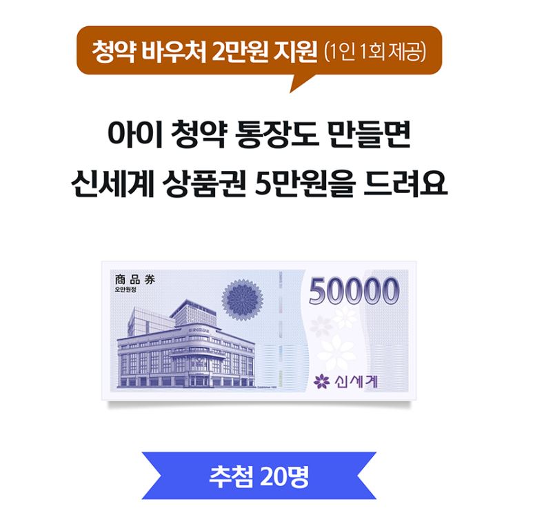 신한은행도 조건은 같습니다. 2017년 1월 1일 이후 출생 아동이 주택청약종합저축 신규 가입시 2만원 지원, MY주니어적금 신규 가입 시 1만 원을 지원해 드립니다. 신한은행에서는 아이 청약 통장 가입 시 신서계상품권 5만 원을 드리는 추첨행사도 진행하고 있습니다. 이벤트페이지 내에서 서비스 통해 통장개설 후 100% 당첨 룰렛 응모하셔야 혜택을 받을 수 있습니다.