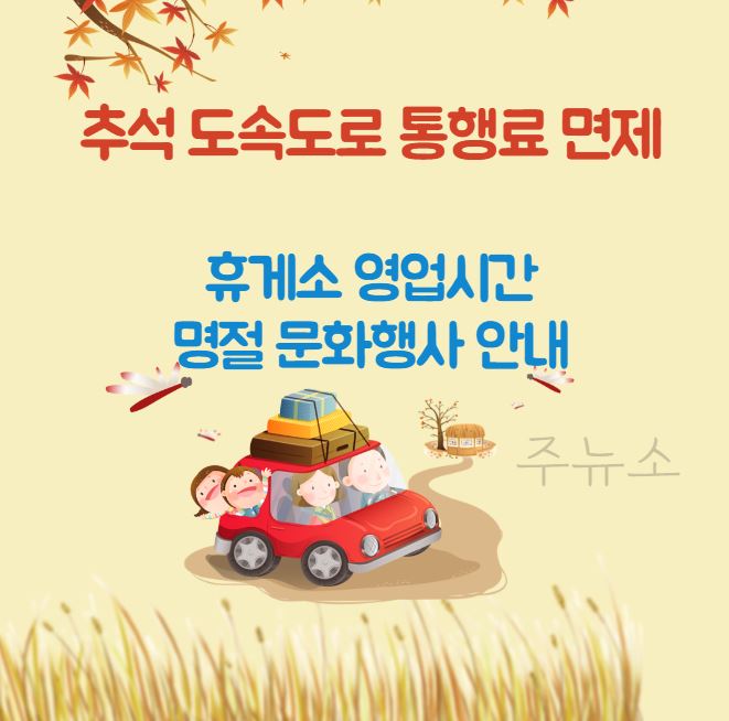 이번 추석 연휴 기간에 전국 고속도로의 통행료가 면제됩니다. 임시공휴일과 개천절이 추석연휴와 붙어있는 만큼 많은 이동이 예상되는데 추석연휴기간 동안의 고속도로 통행료 면제기간과 휴게소 차량 무상정비 서비스에 대해 이야기해보겠습니다