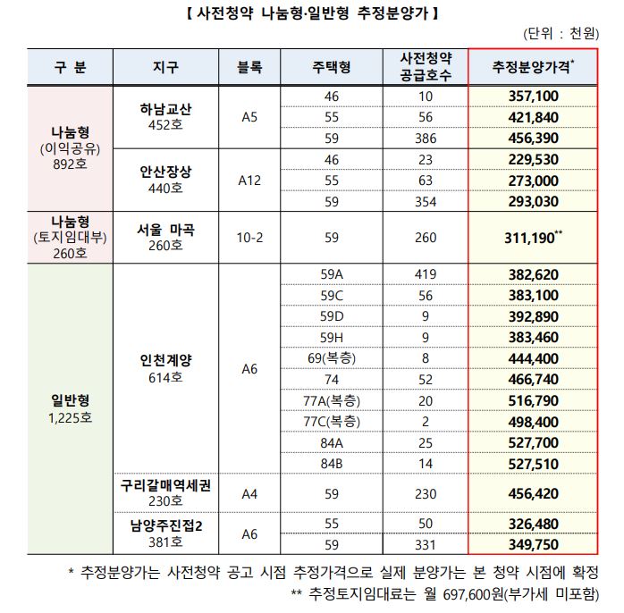 사전청약 추정분양가는 공고 시점을 기준으로 추정분양가를 제공합니다. 이번 9월 뉴홈 3차 사전청약 나눔형과 추정분양가는 전용면적 60㎡ 이하늬 경우 2~4억원대, 전용면적 69~84㎡의 경우 4~5억원대 수준이로 산출되었습니다.