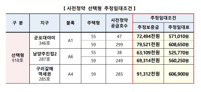 선택형의 경우 공고 시 사전청약 공고시점을 기준으로 한 추정감정가와 추정임대조건(추정보증금, 추정임대료)을제공하며, 실제 입주 시 감정가와 임대조건(보증금 및 임대료)은 본청약에서 공고되는 가격으러 확정됩니다.