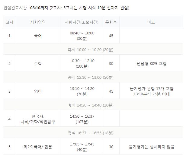 수능 당일 시험장에는 오전 8시 10분까지 입실완료 해야 합니다. 1교시는 08시 40분에 시작하며 시험 시작은 총 80분으로 10:00시까지 치러집니다. 그 후 휴식시간은 20분을 가지며 10시 30분에 2교시 시작되며 시험시간은 100분으로 12시 10분까지입니다. 그 후는 중식시간으로 50분간이며 13시까지 점심시간을 가지고 13시 10분부터 70분 동안 3교시가 시작됩니다. 휴식시간 20분 가진 뒤 4교시는 107분의 시험시간이 주어지며 18분 휴식시간 가진 뒤 5교시는 17시 5분에 가집니다. 40분 수험시간을 끝으로 17시 45분에 시험이 종료됩니다.