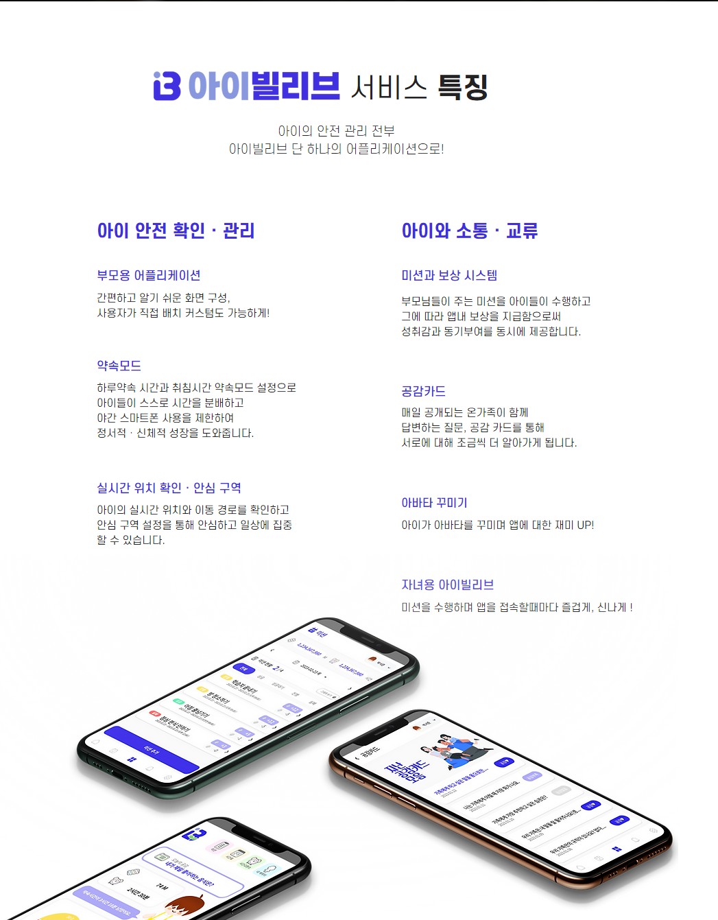 아이 스마트폰 관리 앱인 아이빌리브는 자녀 위치를 실시간으로 위치확인 할 뿐 아니라 아동의 동선도 확인할 수 있습니다. 또한, 무분별한 스마트폰 사용을 줄이기 위해 사용 시간 설정이 가능하며 SNS 모니터링도 가능합니다. 유해 콘텐츠 및 유해 사이트, 위험 앱 차단기능으로 아이의 접근을 막을 수 있으며 아이들에게 관리 앱의 거부감 최소화를 위해 미션과 보상이 주어져 약속을 지킴으로서 아이와 유대감을 형성할 수도 있습니다.