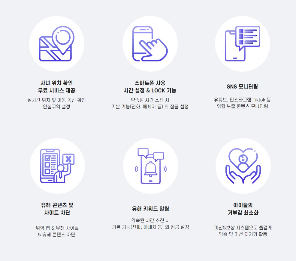 부모님의 경우 이메일이나 SNs계정을 통해 쉽게 가입할 수 있으며, 자녀의 경우 부모님 폰의 스마트폰에 뜬 QR 코드를 통해 가족추가와 설정 및 관리를 할 수 있습니다.