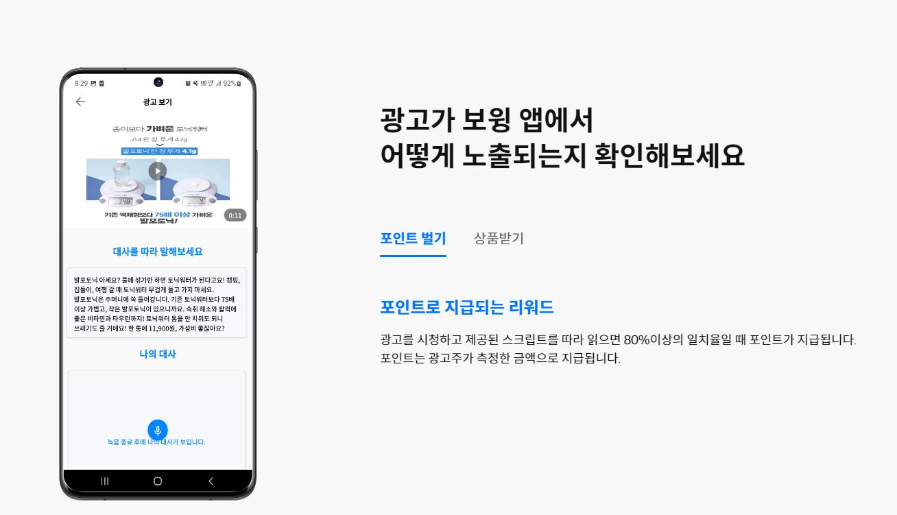 - 보윙 - 음성 AI의 학습용 데이터 수집 후 리워드 지급 / 광고 참여하기 후 광고영상 시청 후 제시된 스크립트를 따라 읽어주고 일치율이 높게 뜨면 포인트 지급 / 튜도리얼 진행 시 300포인트 지급