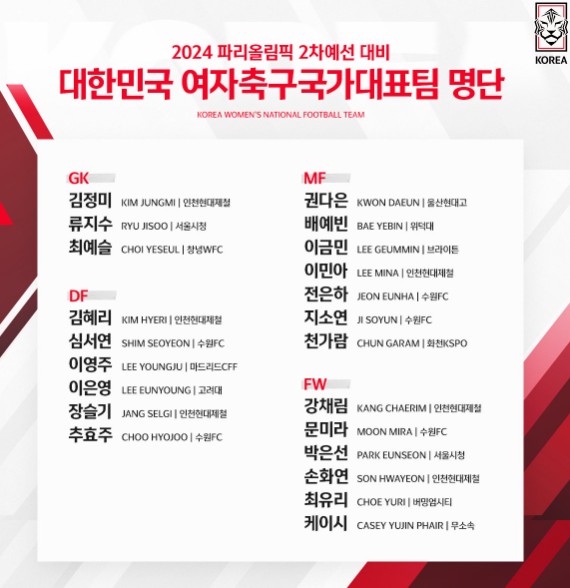 파리올림픽 여자 축구대표팀 아시아 2차 예선 명단 22명은 골키퍼에 김정미(인천현대제철), 류지수(서울시청), 최예슬(창녕WFC), 수비수에 김혜리, 장슬기(인천현대제철), 심서연, 추효주(수원 FC), 이영주(마드리드 CFF), 이은영(고려대)이며 미드필더는 지소연, 전은하(수원FC), 이민아(인천현대제철), 이금민(브라이튼), 천가람(화천KSPO), 배예빈(위덕대), 권다은(울산현대고)입니다. 공격수에는 최유리(버밍엄시티), 손화연, 강채림(인천현대제철), 문미라(수원FC), 박은선(서울시청), 케이시 유진 페어(무소속)입니다.