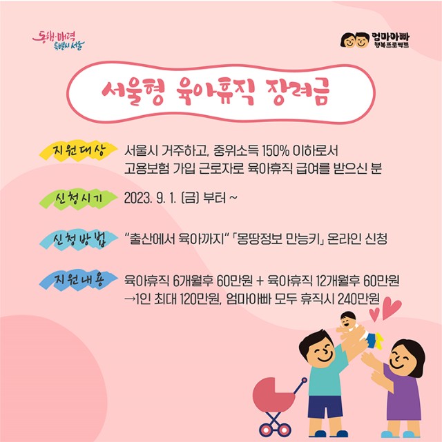 2023 서울형 육아휴직 장려금은 2023년 9월 1일부터 신청 및 지원을 시작하였습니다. 조건을 충족한 육아휴직한 직장인 엄마아빠를 위한 '엄마아빠 행복 프로젝트'의 일환입니다. 서울시에서 새롭게 추진하는 육아휴직 장려책으로 육아휴직한 부모대상으로 저출산 위기 극복을 위한 사업입니다.