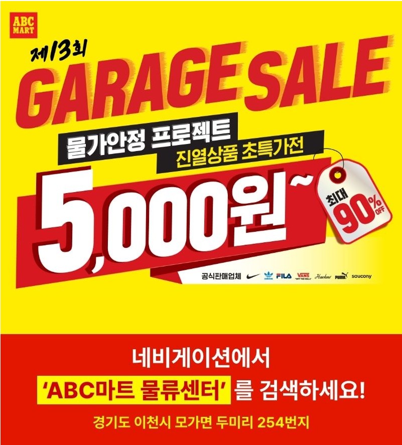 ABC마트 물류센터에서는 물가안정 프로젝트인 제13회 게라지 세일을 진행한다고 밝혔습니다. 품목에 따라 최대 90% 할인 혜택을 볼 수 있는 ABC마트 물류센터 세일에 알아보겠습니다.