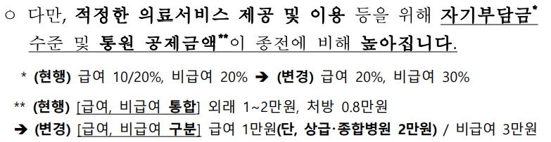 현재 급여 10% + 비급여 20% + 비급여 3종 30% -> 급여 20% + 비급여 30%로 자기 부담금이 상향됩니다.