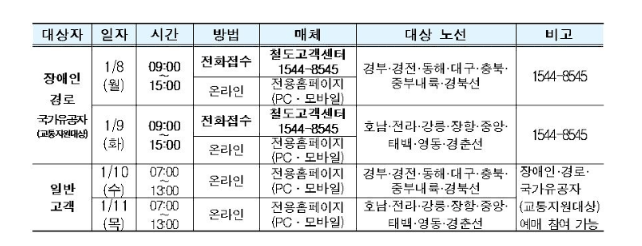 경로·장애인 ·교통 지원 대상 국가유공자 등 교통 취약계층을 배려하기 위해 8일부터 9일까지 이틀간 별도 예매를 진행합니다. 10일과 11일은 모든 국민 대상으로 예약하실 수 있습니다.