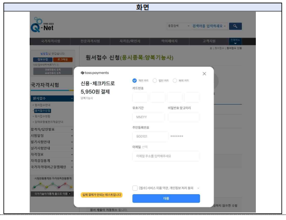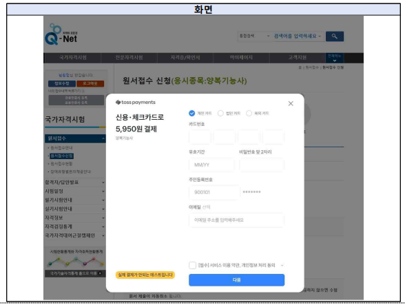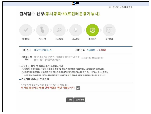 응시료 50% 지원이 적용되었는지 여부를 확인 후 신용카드, 계좌이체, 가상계좌 등의 방법을 선택 후 할인된 응시료로 결제를 지원합니다.