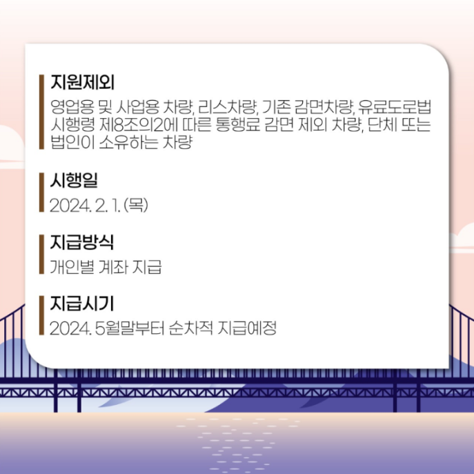 지원제외 차량 - 영업용 및 사업용 차량, 리스차량, 기존 감면차량, 유료도로법 시행령 제8조의2에 따른 통행료 감면제외 차량, 단체 또는 법인이 소유하는 차량