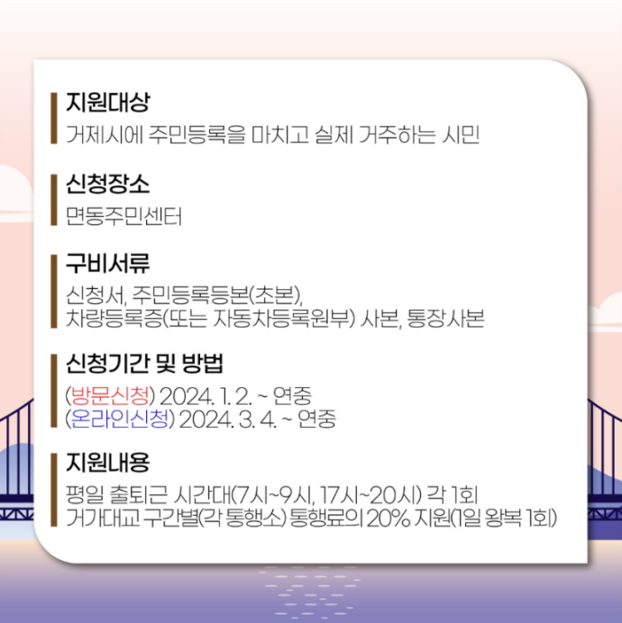 평일 출퇴근 시간대 거가대교 통행료 지원 대상자는 거제시에 주민등록을 마치고 실제 거주하는 시민에 한해서 지원됩니다. 2024년 2월 1일 목요일부터 시행되며, 평일 출퇴근 시간대(7시~9시, 17시~20시) 각 1회 지원되며 거가대교 구간별 (각 통행소) 통행료의 20%를 지원해 줍니다.