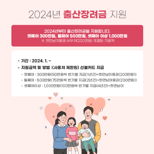 출산지원금은 정부의 첫만남이용권 200만 원을 포함해 첫째 300만 원, 둘째 500만 원, 셋째 이상 1,000만 원 지급됩니다. 영유아가 1세(첫돌)가 되는 해부터 의복, 음·식료품, 가구, 도서, 육아용품에 한정해 사용할 수 있는 선불카드 형태로 반기별 분할 지급됩니다.