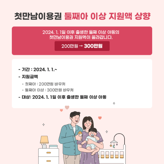 2024년 1월 1일 이후 출생한 둘째 이상 아동의 첫만남이용권 지원액이 올라갑니다.