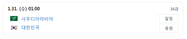 카타르 아시안컵 16강 토너먼트는 1월 28일 20시 30분 호주와 인도네시아의 첫 시합을 시작으로 2월 1일 오전 1시 이란과 시리아의 마지막 경기가 치러집니다. 한국은 1월 31일 수요일 오전 1시 사우디아라비아와 경기를 치를 예정입니다.