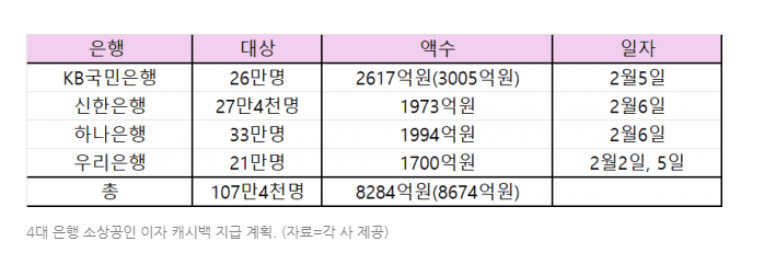 하나은행과, 신한은행, 우리은행은 이달 6일부터 이자 환급을 시행합니다. 하나은행은 약 33만 명의 개인사업자에게 총 캐시백 1994억 원을 지급하며 신한은행과 우리은행도 각각 약 27만 명에 1973억 원, 21만 명에 1824억 원 규모의 이자를 캐시백 지급합니다.