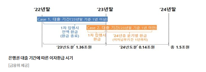 2024년분 납부이자에 대한 캐시백 1422억 원도 분기별로 지급할 예정입니다. 이를 합산하며 은행권에서만 총 1조 5009억 원 규모의 이자 환급을 이뤄지는 것으로, 지원대상은 총 188만 명이고 1인당 평균 환급액은 80만 원입니다.